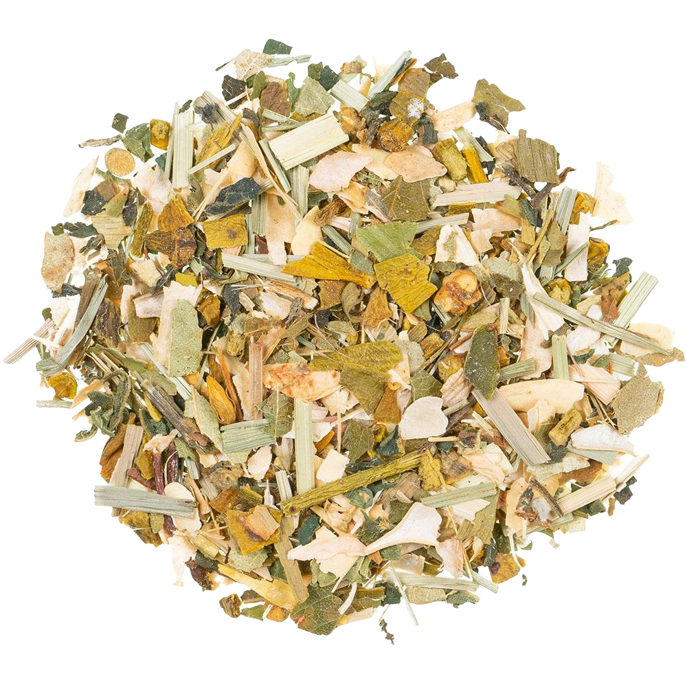 maretak, bonenschillen, berkenbladeren, citroengras (9,9%), brandnetelbladeren, sint-janskruid, ginkgobladeren, aroma’s.