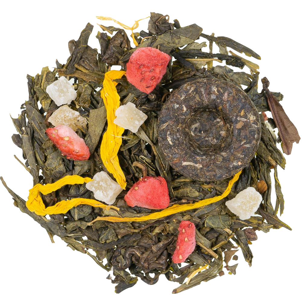 groene thee -China, -Sencha, -Gunpowder, -Mini Tuo, -Chun Mee, witte thee, groene Lung Ching, -Snow Bud, -Pi Lo Chun, gekonfijte stukjes ananas (ananas, suiker)(6%), aroma’s, stukjes aardbei (2%), zonnebloembloesems.
