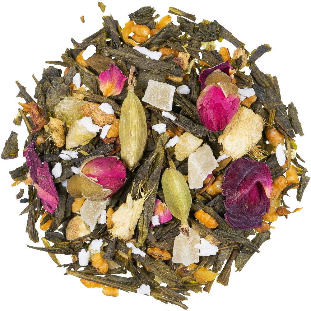 groene China Sencha, stukjes gember, geroosterde rijst, gekonfijte stukjes mango (mango, suiker), gekonfijte stukjes ananas (ananas, suiker) (6,5%), kokosschilfers, aroma’s, gekonfijte stukjes papaya (papaya, suiker), kardemom, bamboescheuten (2%), rozenbloesembladeren, rozenknopjes.