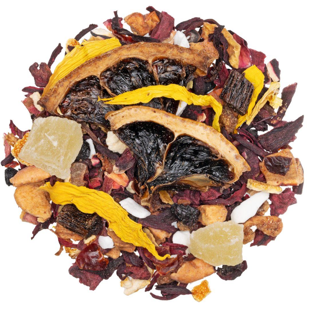 hibiscusbloesems, appelstukjes, gekonfijte ananasstukjes (ananas, suiker), sinaasappelschillen, rozenbottelschillen, stukjes rode biet, vlierbessen, citroenschillen, natuurlijk aroma, yoghurtstukjes (magere-melkyoghurtpoeder, suiker, maltodextrine, gemodificeerd zetmeel: dizetmeelfosfaat, zuurteregelaar: citroenzuur), zonnebloembloesems, vanillestukjes(0,5%)