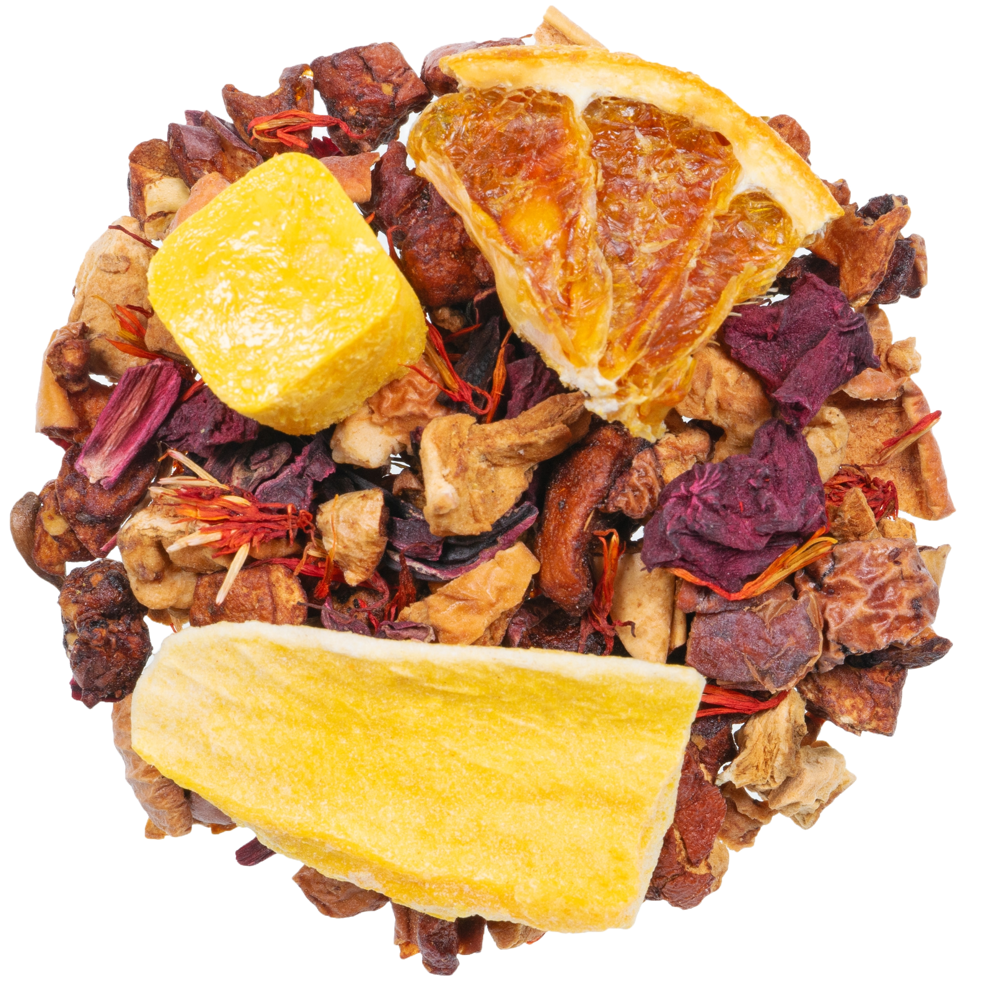 stukjes appel (appel, zuurteregelaar: citroenzuur), natuurlijk aroma, schijfjes bloedsinaasappel (5%), hibiscusbloemen, stukjes passievrucht (4%), stukjes rode biet, schijfjes mango, vitamine C (1,5%), saffloerbloemen.