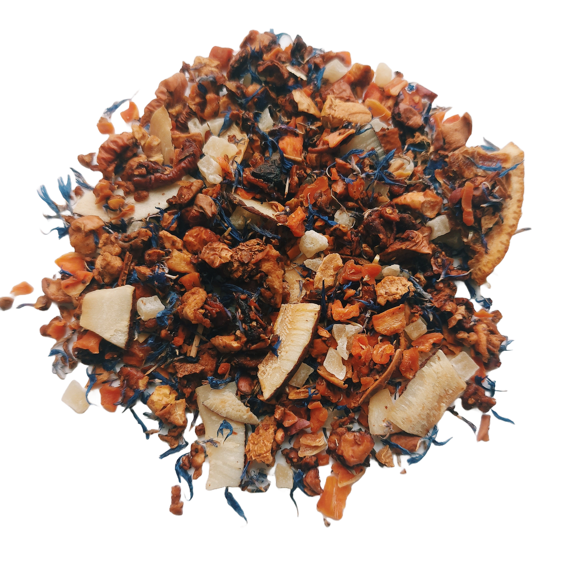 Appelstukjes (appel, zuurteregelaar: citroenzuur), wortelstukjes, gekonfijte ananasstukjes (ananas, suiker), kokosreepjes (8%), aroma, sinaasappelstukjes, korenbloembloesem.