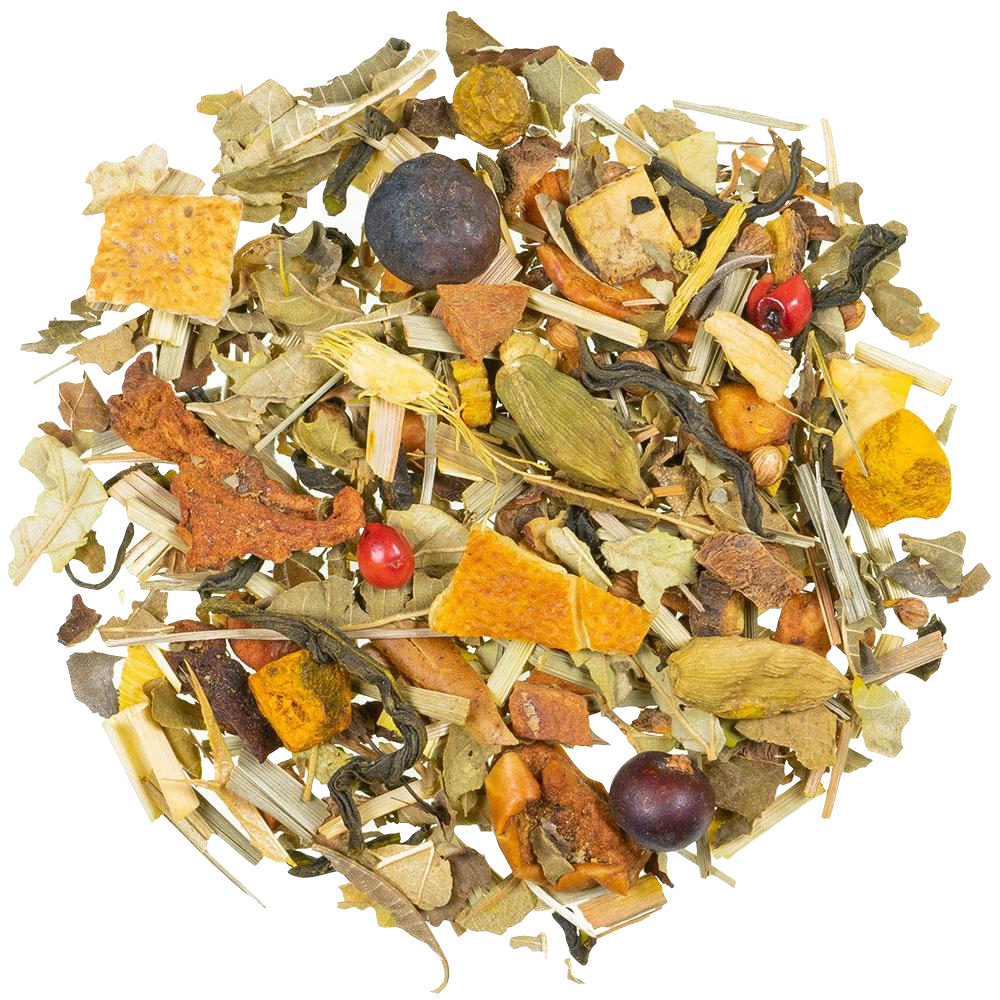 stukjes appel (appel, zuurvormer: citroenzuur), citroengras, zoethoutwortel, groene thee (10%), braambesbladeren, natuurlijke aroma’s, sinaasappelschillen, stukjes gember, kaneel, koriander, jeneverbessen (4%), kurkuma, ijzerkruid, citroenschillen (2%), roze peper, kardemom