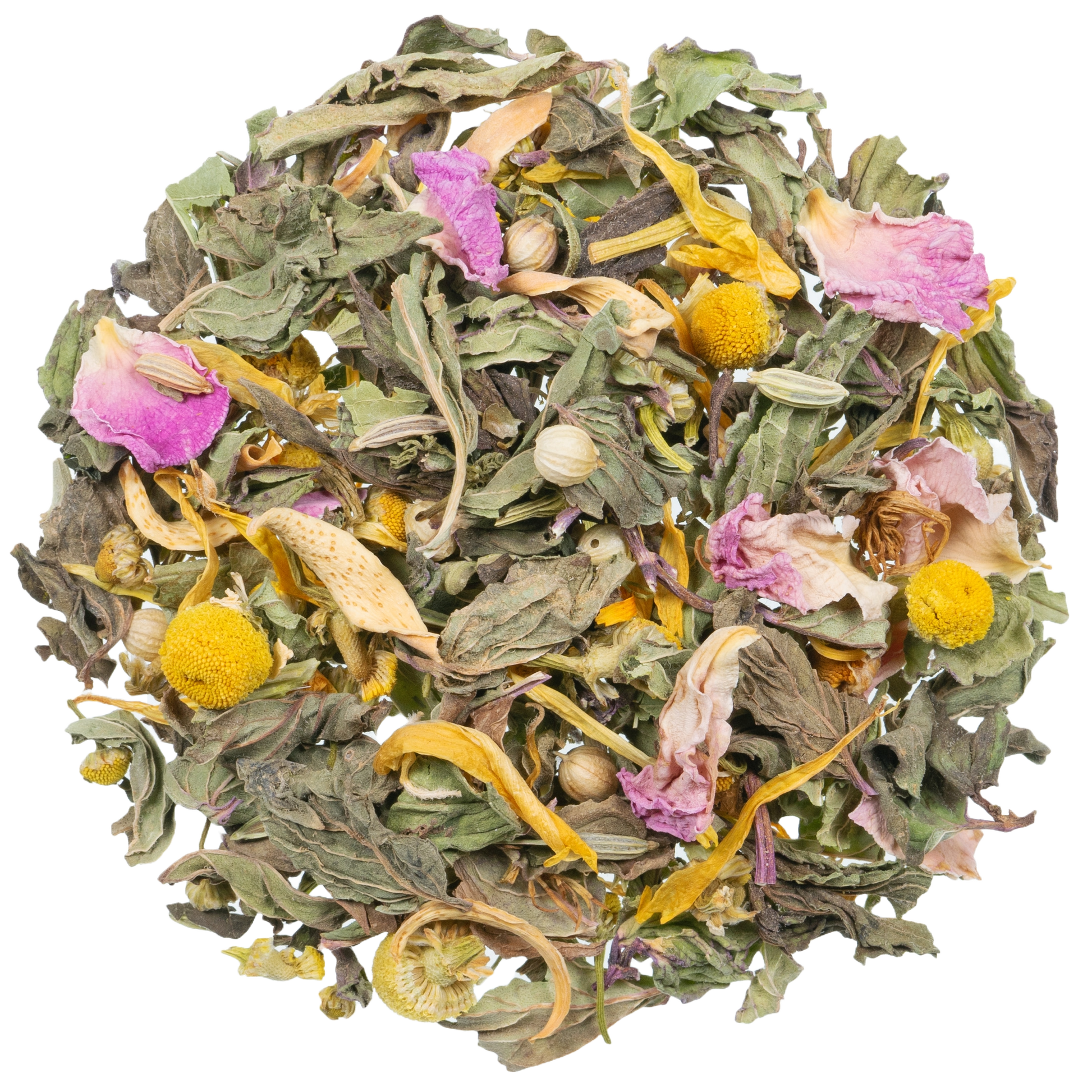 Venkel*, pepermuntblaadjes*, kamillebloesem*, tulsikruid*, korianderzaad*, citroenmelisseblaadjes*, rozenbloesemblaadjes*, goudsbloembloesem*, sinaasappelbloesem*, Passiebloemkruid*.