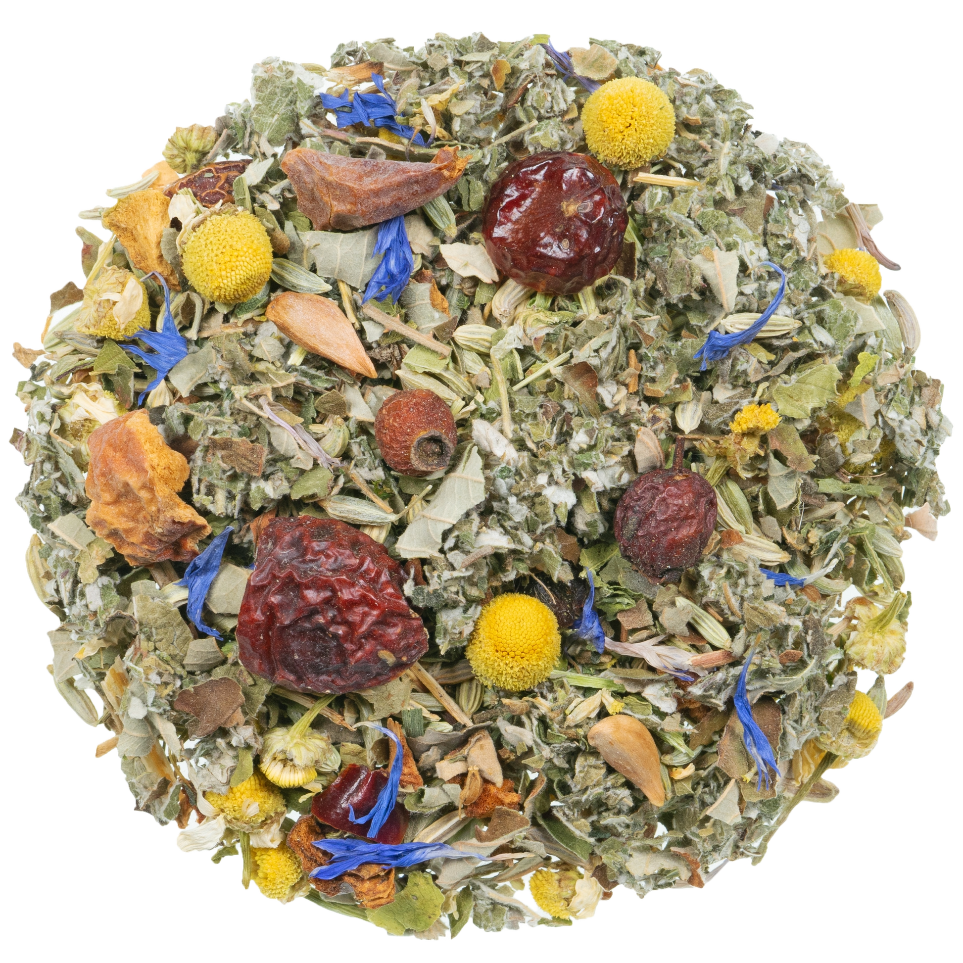 Venkel*, kamillebloesem*, frambozenblaadjes*, braambessenblaadjes*, stukjes appel*, anijs*, malveblaadjes*, rozenbottelschillen*, brandnetelblaadjes*, meidoornbessen*, korenbloembloesem*.