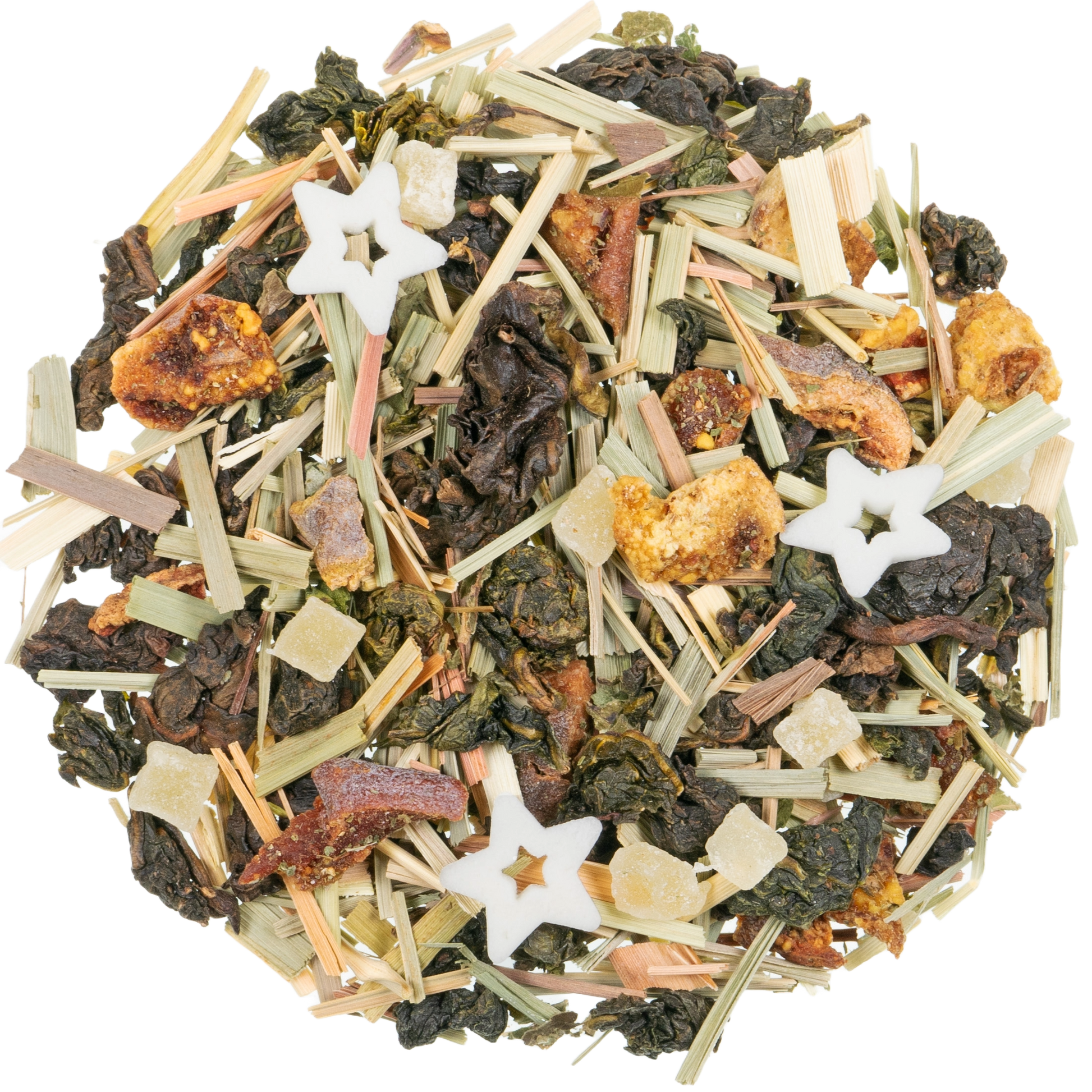 oolong thee, stukjes peer, citroengras, gekonfijte stukjes ananas (ananas, suiker)(8%), moerasspirea kruid, witte suiker sterren (suiker, rijstbloem, cacaoboter, aardappelzetmeel), natuurlijk aroma