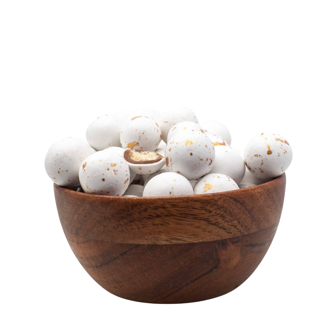 Ingrediënten: suiker, volle MELKpoeder, cacaoboter, rijstebloem, cacaomassa, TARWEmout, dextrose, zetmeel, dextrine, verdikkingsmiddel E412 E414 E415, emulgator: SOJAlecithine, natuurlijk vanille aroma, glansmiddel E414 E904, kleurstof E172