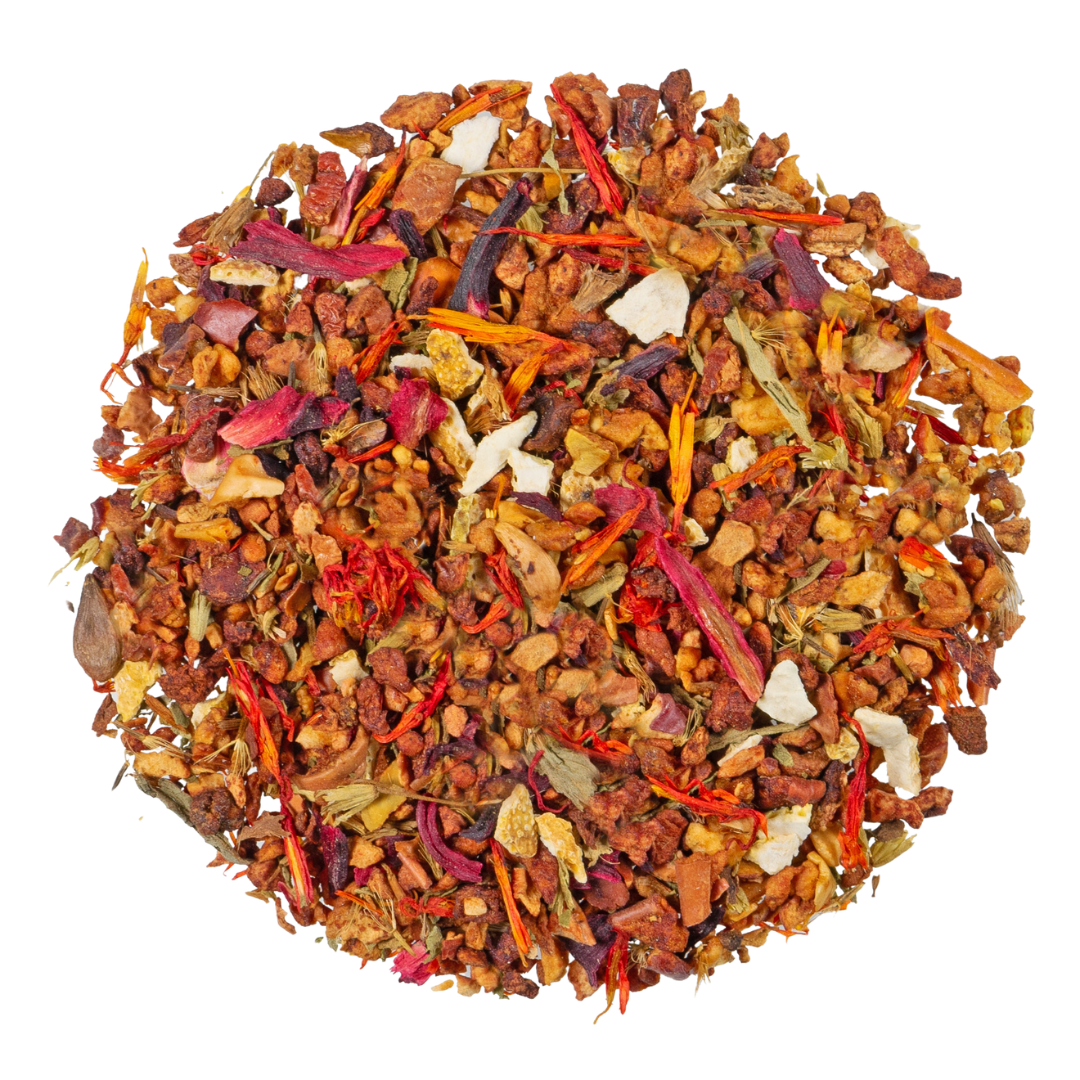 appelstukjes (appel, zuurteregelaar: citroenzuur), sinaasappelschillen (10%), hibiscusbloesems, sweetleaf, natuurlijk aroma, saffloerbloesems