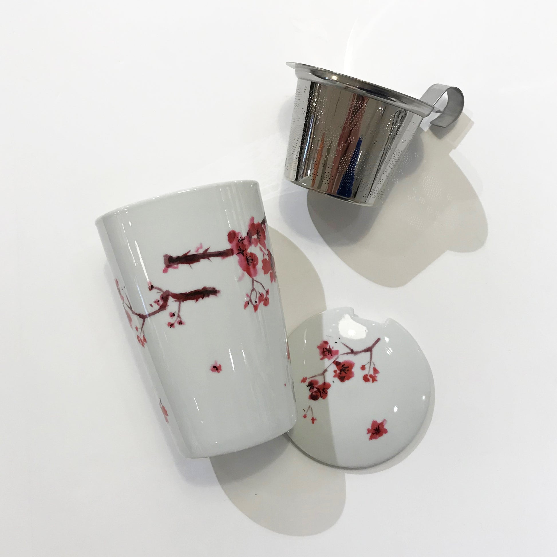 Porseleinen mok en deksel met filter in roestvrij staal.