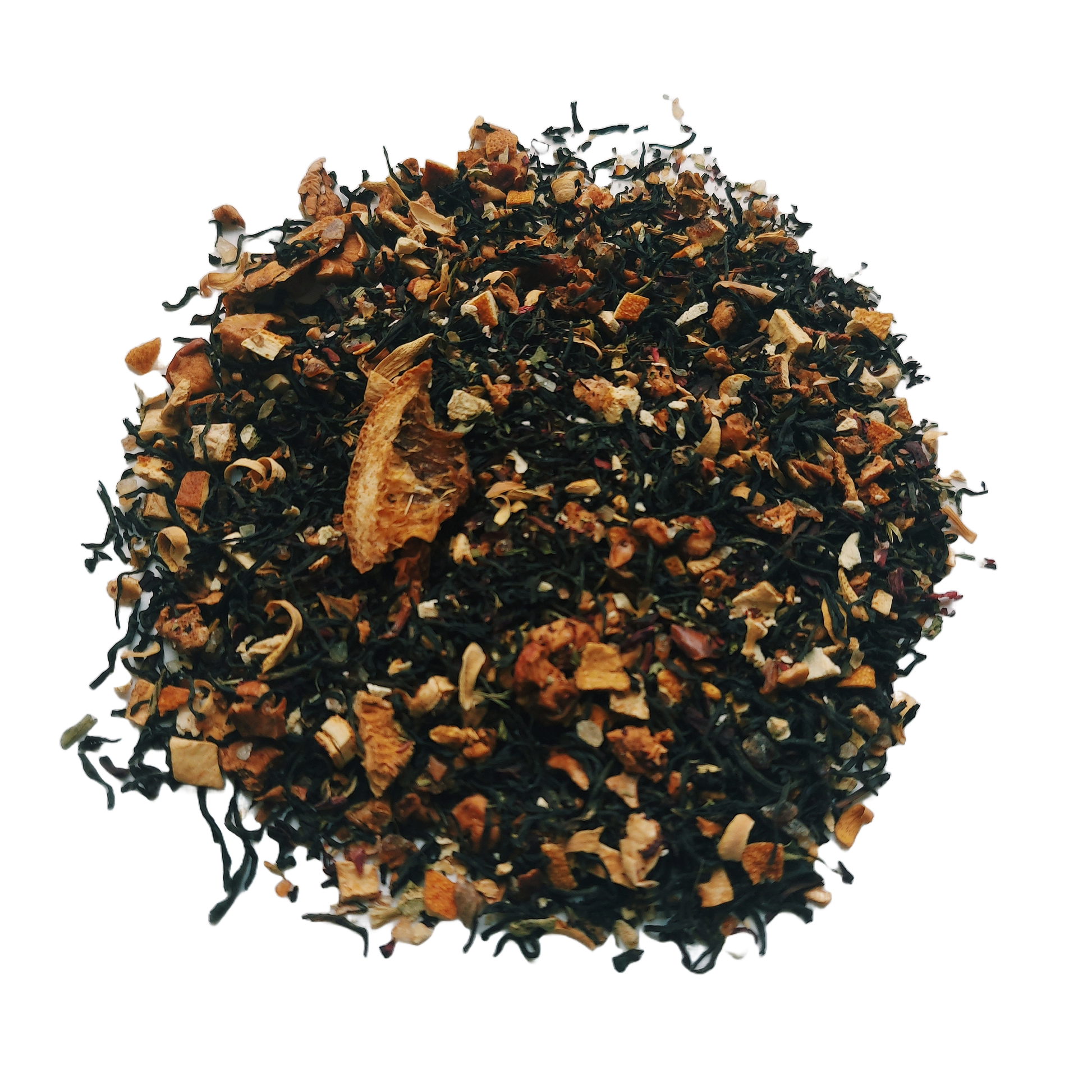 Zwarte thee, appelstukjes, sinaasappelschillen(13%), bruine suiker, hibiscusbloesems, natuurlijk aroma, sinaasappelstukjes(3%), tamarinde, steviablaadjes , sinaasappelbloesems.